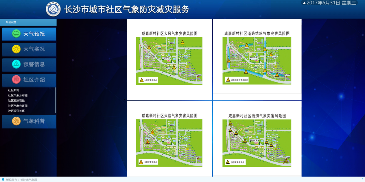 长沙社区气象触摸屏是中国气象走进社区,为社区提供专业气象服务的标杆试点工程,得到长沙市委市政府、市人大领导的参观认可,系统平台包括都市天气、气象产品、社区服务三大版块,提供气象预报、雷达图、云图、环境气象、指数气象、交通气象等社区气象服务产品。触摸屏端主要实现气象预警、天气实况、天气预报、服务产品、气象指南及社区服务等信息内容的查询展示功能。